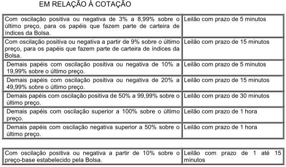 Demais papéis com oscilação positiva ou negativa de 20% a 49,99% sobre o último preço. > Leilão com prazo de 15 minutos.